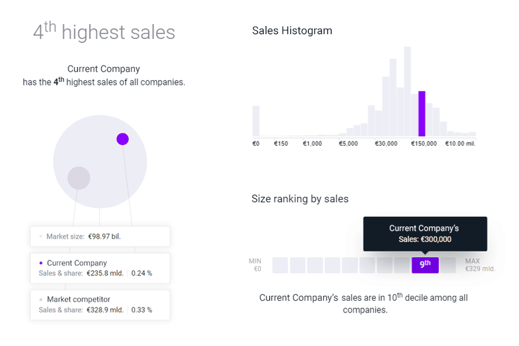Choose any company within HitHorizons Screener and see its essential data in one place. Advanced analyses of individual companies’ industries based on location data and industry classification (region, industry, country, SIC CODE etc.) and expanded company size rankings based on sales and number of employees provide additional insights.