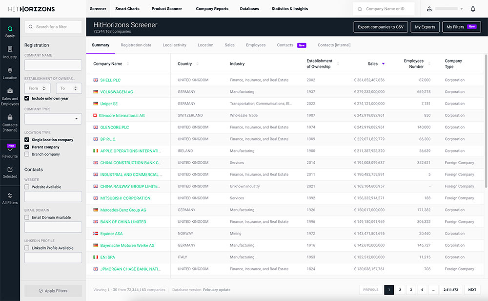HitHorizons Screener allows you to sort companies based on a set of parameters (such as sales, number of employees, name, establishment of ownership or country) and create various rankings and lists. Identify top companies by sales and number of employees or identify the oldest players within the segment you are interested in.