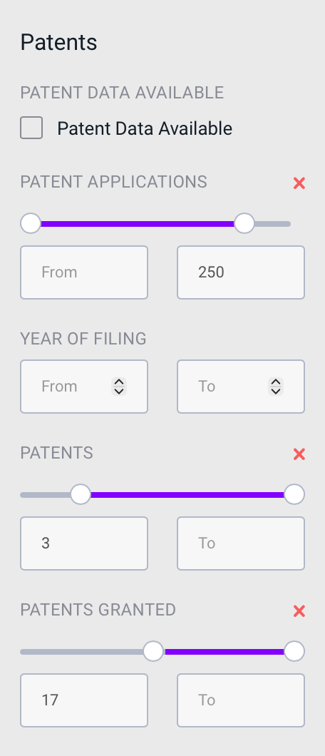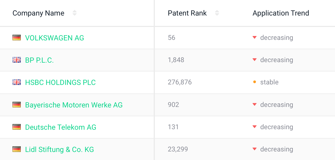 In the HitHorizons Screener, the Patents Application Trends column provides a quick snapshot of the current patent activity trend among your filtered companies. It categorizes trends into three types: increasing, stable, and decreasing. You can also use this column as a filter to narrow down companies based on their patent application trajectory.